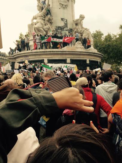« Dignité humaine », « ils ont financé vos guerres, construisons votre accueil », « Bienvenue aux réfugiés », ou encore « il s’appelait Ayral… Repose en paix petit ange », pouvait-on lire sur les pancartes brandies entre les drapeaux d’Europe Ecologie les Verts (EELV), du Front de gauche, du NPA et d’Amnesty international.