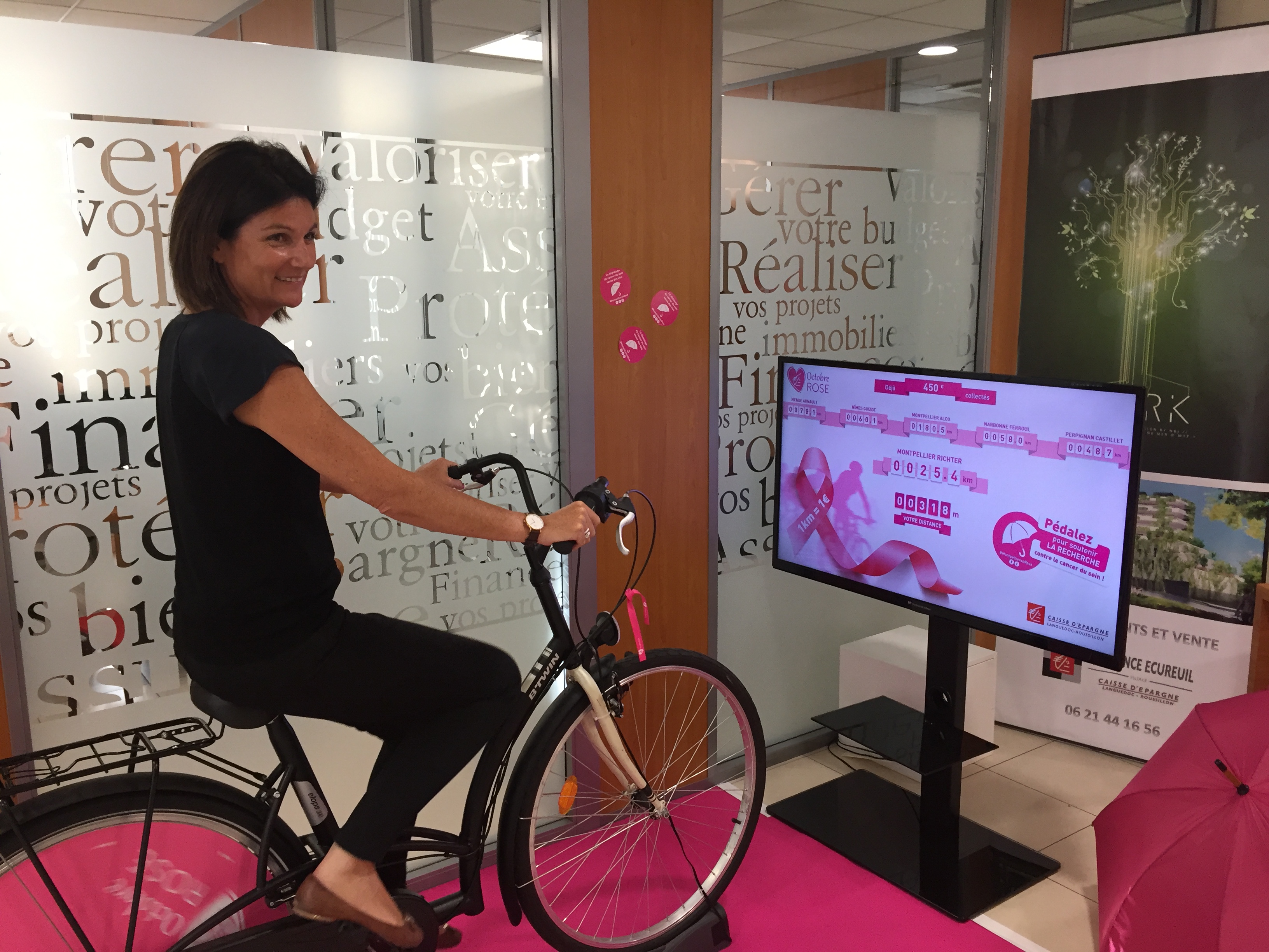 Du 4 au 19 octobre, des vélos fixes seront installés dans les agences Caisse d’Epargne de Montpellier Richter, Narbonne Ferroul, Mende Arnault, Perpignan Castillet, Nîmes Guizot et au sein du Siège de la banque à Montpellier Alco. Clients et collaborateurs seront incités à multiplier les kilomètres pour faire avancer le sujet. Pour chaque kilomètre parcouru, la Caisse d’Epargne remettra 1 euro au Collectif Octobre Rose, l’objectif étant d’atteindre les 10 000 kilomètres.