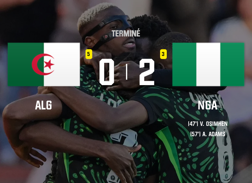SCORE FINAL : ALGÉRIE 0 - 2 NIGÉRIA. C'est terminé ! Les Fennecs sont éliminés de la CAN 2025 après une masterclass des Super Eagles. Victor Osimhen (47') et Akor Adams (57') ont scellé le sort de l'Algérie dans ce quart de finale à sens unique au Stade de Marrakech. Le Nigéria affrontera le Maroc en demi-finale.