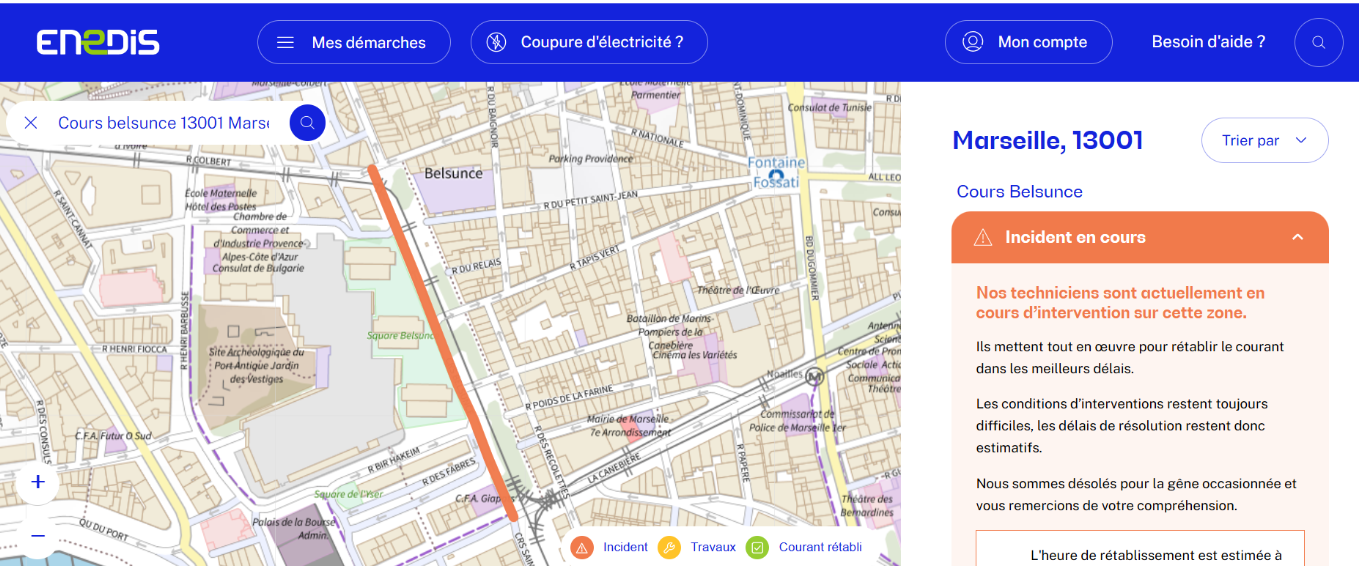 Selon les premières estimations, la panne aurait concerné plusieurs rues autour du cours Belsunce, du boulevard Dugommier et du cours Saint-Louis. Le courant aurait été progressivement rétabli en fin d’après-midi, mais certaines zones restaient encore affectées vers 17 h.