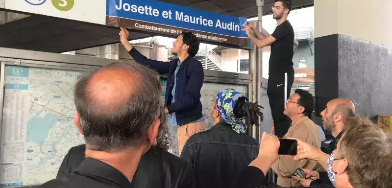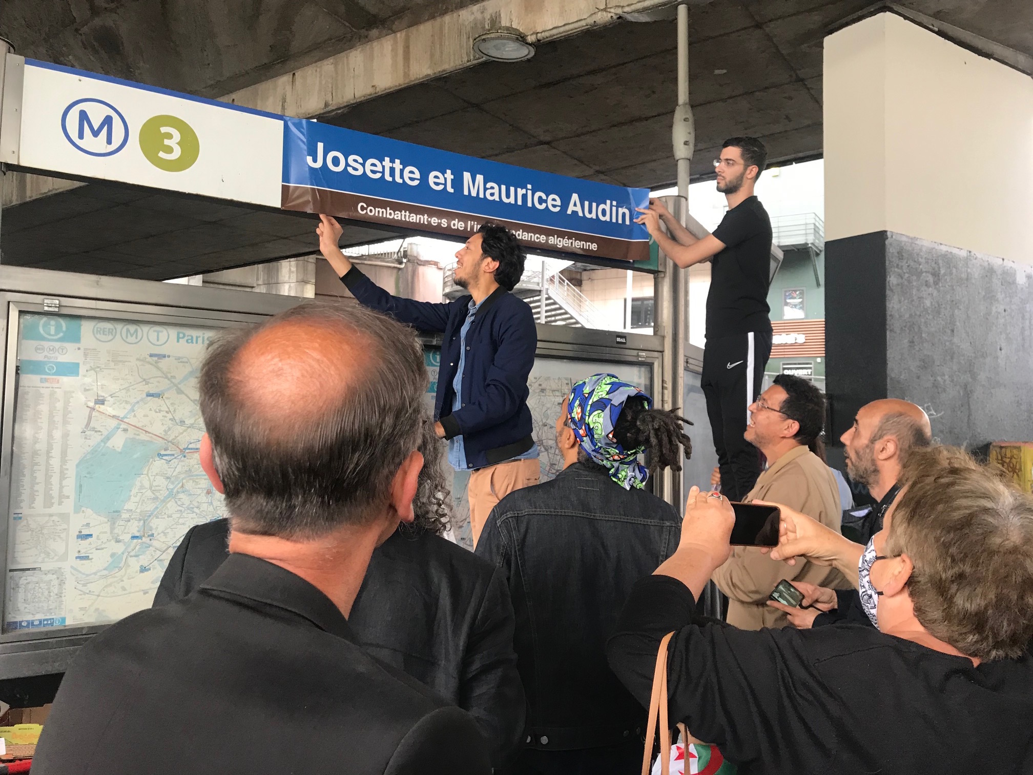 Plutôt que cette trace indigne dans un lieu public, hommage à Josette et Maurice Audin, combattant-e-s de l’indépendance algérienne ! Lumière sur la mémoire, « c’est fini le temps des colonies ! ». La plaque au nom du couple historique a brillé quelque instants, le temps de l’intervention des musclés de la police SNCF venus l’arracher.