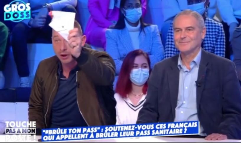 Cyril Hanouna: «Alors Oliv Oliv, est-ce que tu as brûlé ton passe ?» Oliv Oliv: «Non, mais je vais le faire symboliquement ce soir Cyril. J'ai mon passe, parce que pour venir sur ce plateau on est obligé de faire des passes. Et là, je vous lance un message : ça, c'est la flamme de la liberté et j'espère qu'on va retrouver nos libertés pour nous et nos enfants. Vous voyez, c'est symbolique, mais moi, je le fais devant vous, monsieur.» François Jolivet: «Moi, j'en ai marre qu'on restreigne des libertés à des gens comme moi, qui suis vacciné, qui ai d'ailleurs attrapé le covid.»