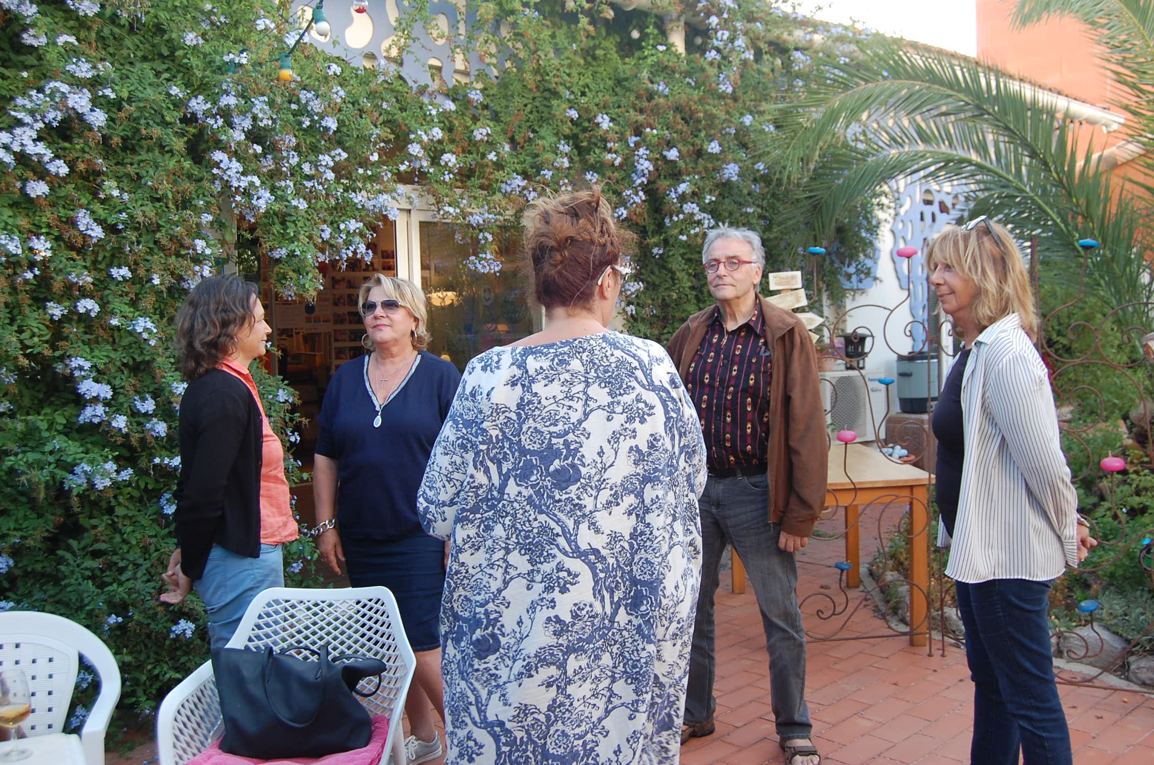 La petite dizaine de participants, lundi soir, ont d’abord écouté une histoire, celle de la parisienne qui découvre dans un reportage à la télévision, les prodiges que réalise un médecin indien, qui soigne ses patients par le rire ! Corinne rencontre ce médecin à Mulhouse au cours d’un stage, qu’elle a alors envie de mettre en pratique, elle, « la joyeuse, mais pas forcément rigolote de nature », à Frontignan. Très vite, Corinne cherche à appliquer les techniques dur rire à travers la chorale ou elle chante, puis sur la plage-un lieu de nature sacré , pour elle- où en 2001, les curieux se précipitent, au nombre de 500 ! TF1 est alerté, vient faire un reportage et voilà la rigologie lancée sur le plan national et même international puisque la Maison du Bonheur » du 1, rue de la Coste à Frontignan est désormais le siège de "L'Ecole Internationale du Rire ". Devenue « porteuse d’eau dans le désert », Corinne a désormais bien des voyages à faire dans le monde entier pour apporter tous les bienfaits de la rigologie sur les gens et même ceux atteints de fibromyalgie, dit-elle. La technique qui consiste à évacuer toutes sortes d’émotions pour obtenir une « fluidité émotionnelle », qui mène à « la méditation du rire » est désormais au point et Corinne, ce lundi soir, a proposé à son assistance de prouver les bienfaits de ses techniques, sur le terrain, dans la salle principale de la Maison du Bonheur. Une petite mise en bouche autour d'un muscat, pour l'accueil...