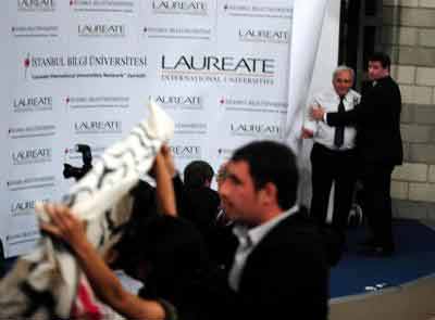 Une autre étudiante qui tentait de déployer une banderole et d'approcher la plateforme a été également maîtrisée, tandis que plusieurs autres manifestants dans la salle scandaient "FMI, va-t- en de la Turquie".