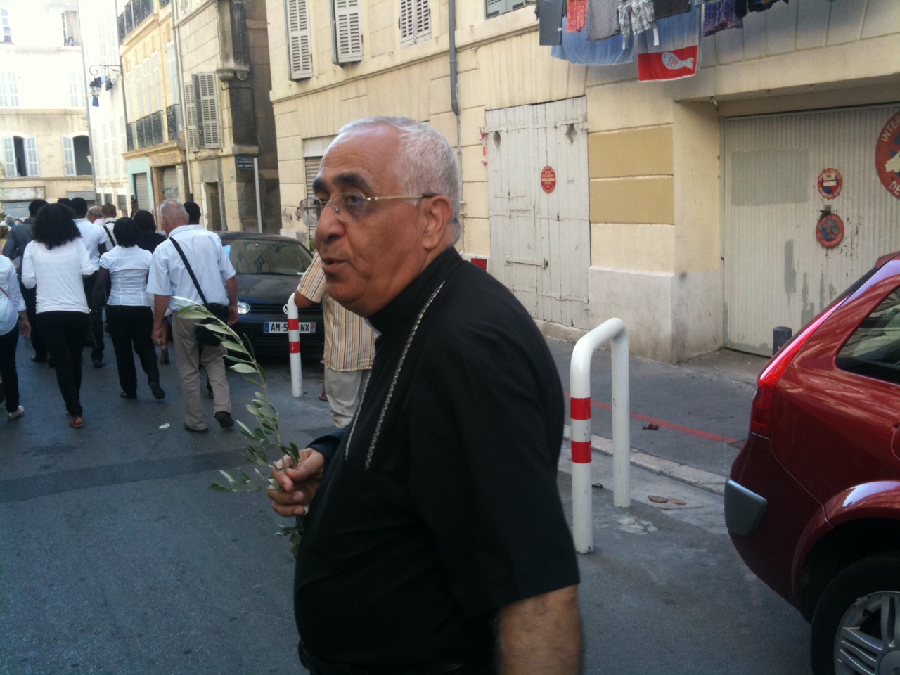 La procession était organisée par l’Institut Catholique de la Méditerranée pour le vingt-cinquième anniversaire de la rencontre d’Assise en 1986 (1). Présent la veille pour la cérémonie de rentrée académique de l’établissement, Maroun Lahham, évêque de Tunis, d’origine palestinienne, s’est exprimé sur la portée et les enjeux de cet évènement pour la «Méditerranée d’aujourd’hui».