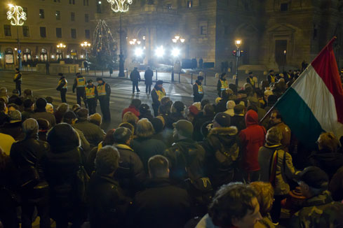La manifestation a eu lieu près de l'Opéra de Budapest, où le Premier ministre hongrois Viktor Orban, le président Pal Schmitt et d'autres dignitaires participaient à une cérémonie en l'honneur de la nouvelle charte.