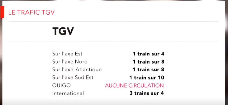 Sur les grandes lignes, la SNCF prévoit un TGV sur huit en moyenne, l’axe Sud-Est étant le plus touché (un sur 10). Même chose pour les Intercités, dont sept lignes ne seront carrément pas desservies. Le patron de l’entreprise, Guillaume Pepy, avait averti que des lignes seraient « fermées ».