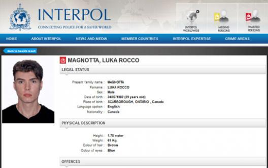 A la demande des autorités canadiennes, l'Organisation internationale de police criminelle (Interpol) avait publié jeudi une notice rouge, ou avis de recherche international, à l'encontre de Magnotta, un homme de 29 ans également connu sous le nom d'Eric Clinton Newman ou de Vladimir Romanov.