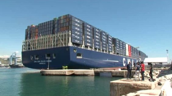 Le président François Hollande a inauguré mardi à Marseille le Jules Vernes, porte-conteneurs géant battant pavillon français.