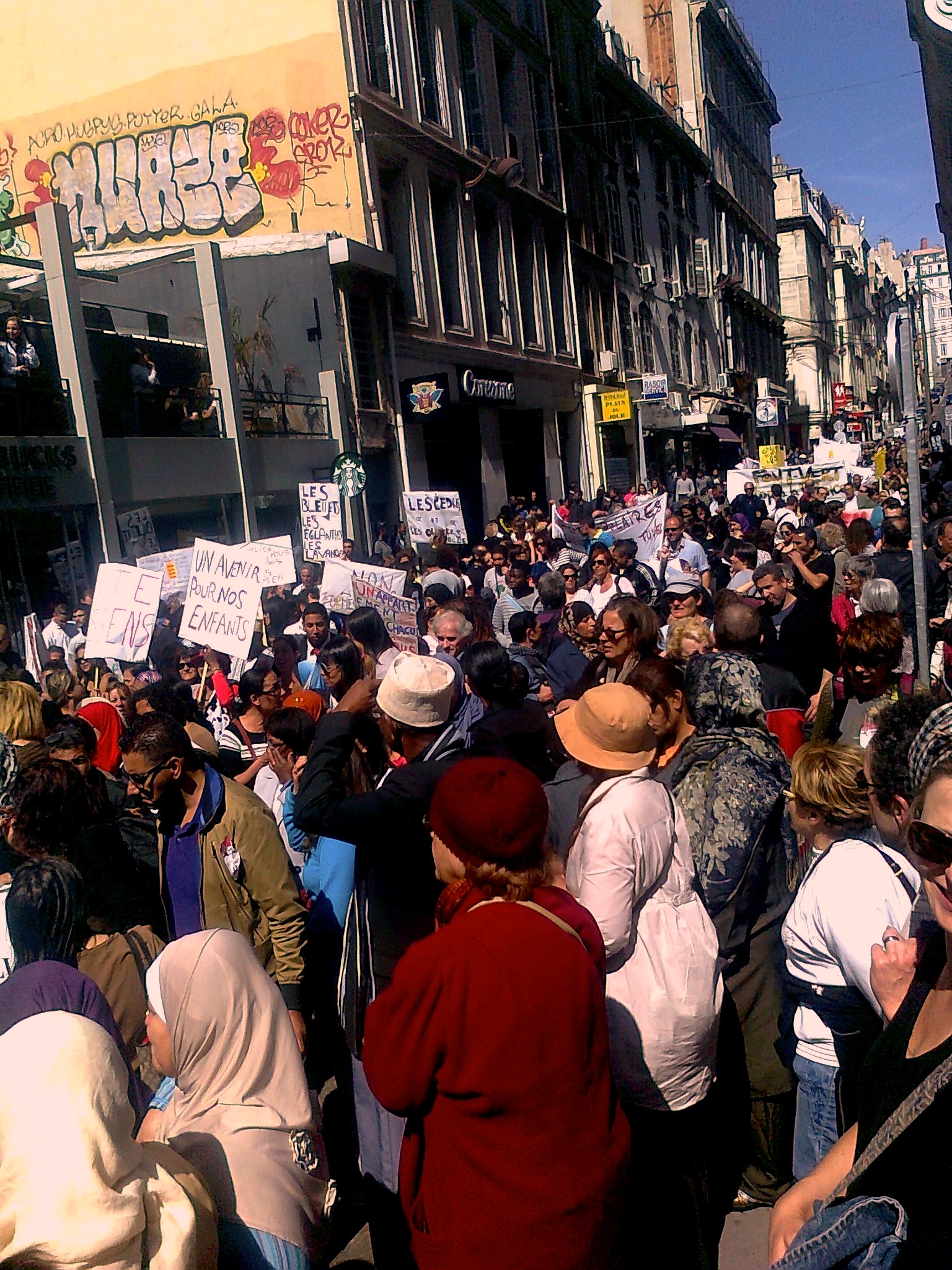 Quand la manifestation commence à descendre le boulevard d’Athènes, Marie-Arlette Carlotti longe le cortège, prête à le quitter. La ministre, candidate à la mairie ne veut pas être prise en flagrant délit de récupération. Surtout pas. Elle entend se montrer humble, et assume sa discrétion, tout en ouvrant la porte.