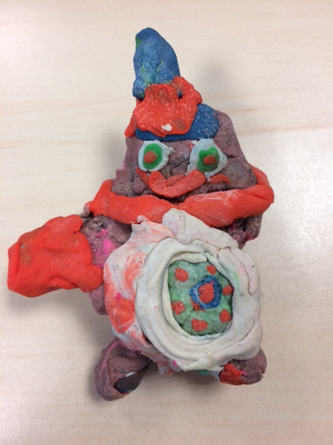 Il va avoir l’âge précisément que célèbre Rimbaud, ce météore, dans « Les poètes de sept ans » : « Il faisait des romans, sur la vie du grand désert, où luit la Liberté ravie, Forêts, soleils, rives, savanes! »… – L’œuvre dont nous parlons de cet enfant est un simple bonhomme en pâte à sel peinte, semble t-il. A un sens aigu de la forme il associe une fine compréhension de la couleur et une étonnante maîtrise des oppositions de complémentaires et des toniques. Soit une dominante orangée, dopée par des pointes de vert et un bonnet bleu.