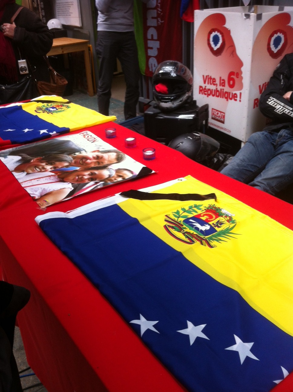 A L'Usine, l'ancien siège de campagne de Jean-Luc Mélenchon aux Lilas (Seine-Saint-Denis), les drapeaux vénézuéliens étaient en berne mercredi 6 mars. Tout comme la cravate de l'ancien candidat à la présidentielle. Lors d'une conférence de presse organisée suite à la mort du président vénézuélien Hugo Chavez, M. Mélenchon n'a pas ménagé sa peine pour rendre un hommage appuyé à un homme politique qu'il admirait. Dès l'annonce de la mort d'"El Comandante", mardi soir, un tweet évoquant "Ce qu'il est ne meurt jamais" était posté sur le compte officiel du coprésident du Parti de gauche.