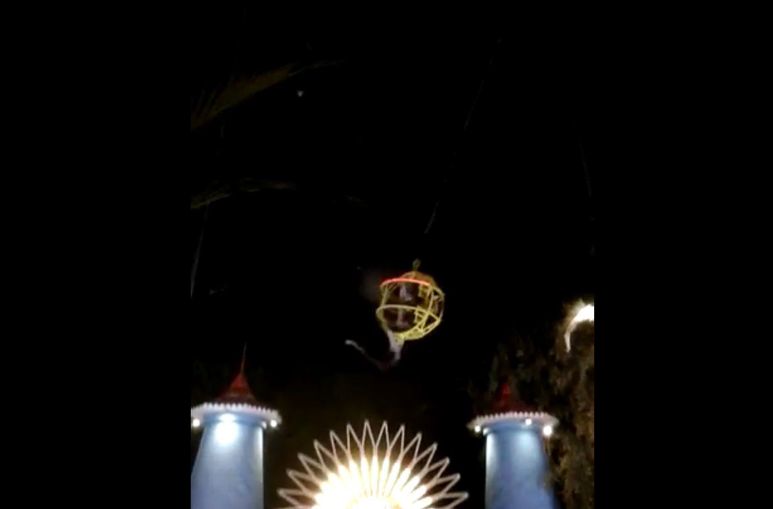 A la 40ème seconde, on voit la boule redescendre et percuter l'un des pieds du manège après que l'une des deux attaches de la boule ait cédée. « Une quadragénaire a été blessée à la jambe », précise Hérault H-24, regardez :