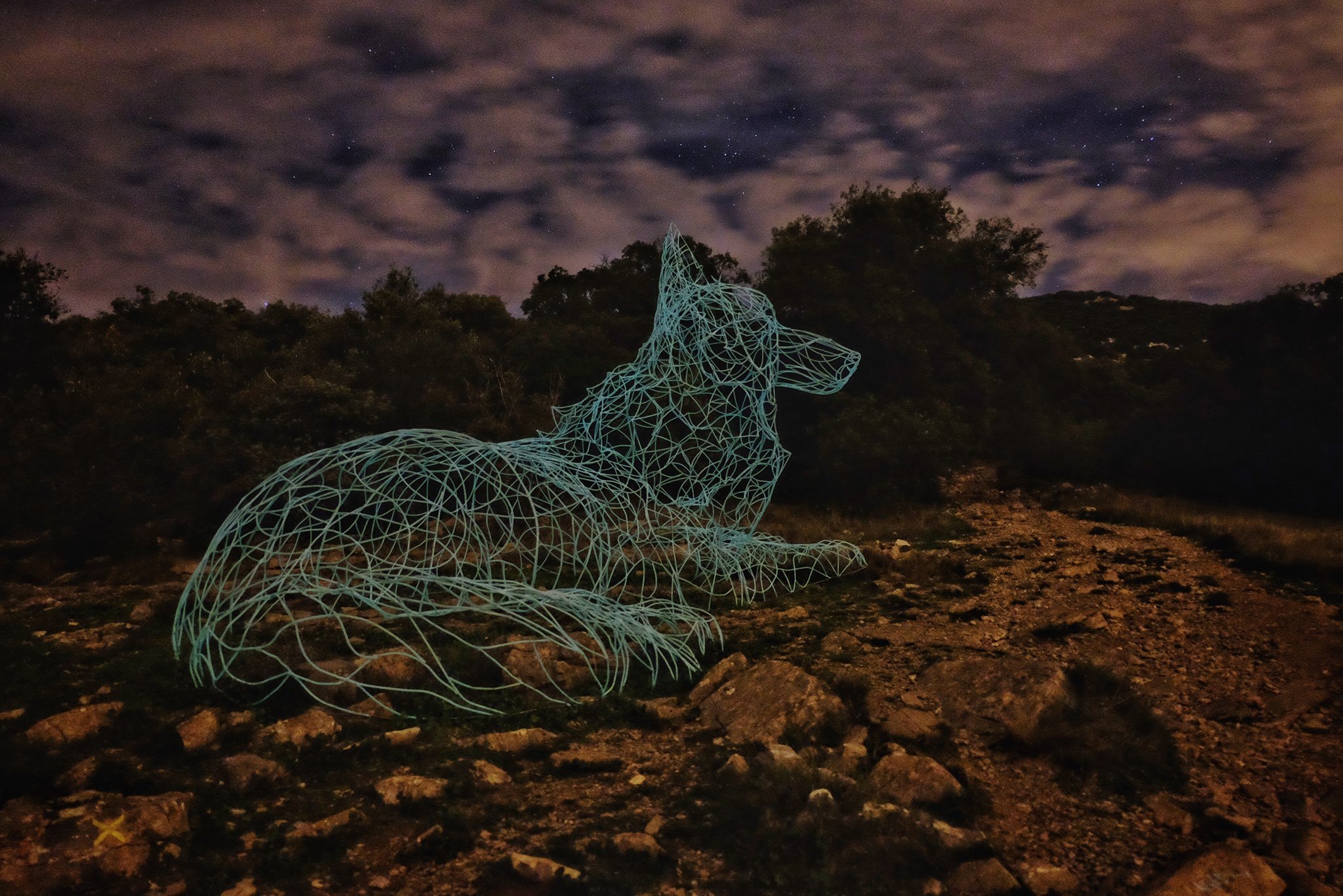 Au tout début du commencement de cette histoire, il était une fois un loup. Un loup qui avait posé ses pattes sur un sentier sauvage du Pic Saint-Loup dans le cadre de l’exposition Aux bords des Paysages et avait immédiatement séduit le public. Un public immédiatement sensible à cette œuvre d’art magistrale qui était tout naturellement entré en dialogue avec elle, de nuit, comme de jour.