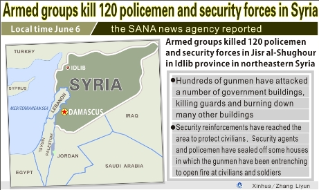 Entre temps, le régime de Bachar Al-Assad continue à écraser dans le sang toute contestation. Les autorités ont annoncé mercredi l'envoi de troupes en renfort à Jisr Al-Choughour, une ville du nord-ouest du pays où, selon le régime, cent vingt policiers ont été tués par des "groupes armés".