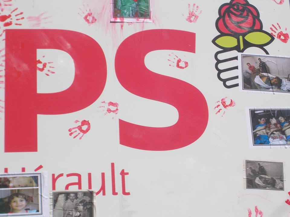 - Les allégations du PS34 qui le soir même déclarait à la presse qu’il allait porter plainte en raison des dégradations commises. Il s’agit plus exactement de « mains rouges » symbolisant la complicité du gouvernement PS dans les crimes commis à Gaza par Israël, apposées sur des affiches et visuels du PS à l’intérieur comme à l’extérieur sur le panneau de bois en façade. Nous avions pris la précaution de prendre une peinture acrylique lavable, utilisée dans les écoles et dont le nettoyage à l’eau ne devrait poser aucune difficulté.