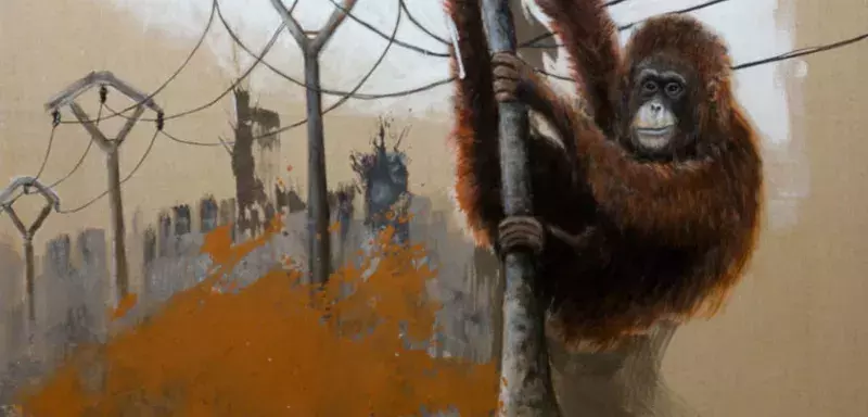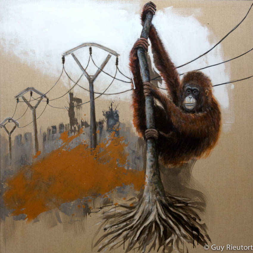 Dans la nature le comportement intrusif de l'homme continue - par la déforestation et d'autres aberrations - mais j'ai terminé ce tableau avec une note positive d’équilibre : l'arbre qui est marqué comme prêt à abattre repousse. Tel Tarzan ou Superman, Rango est revenu, et il est soutenu par une branche en forme de corne de buffle et se balance suspendu à une fausse queue de tigre, tandis que le tigre et bien vivant.Comme touche finale, j'ai esquissé à la bombe une figure humaine stylisée qui s'avance, tandis que le film est rembobiné - (petite allusion également à La Linea, créée par le dessinateur Osvaldo Cavandoli qui était diffusée dans les années 1970, et que j'adorais regarder) - Par cette figure j'ai voulu faire allusion à un certain nombre de paradoxes propre à l'homme. Bref, parfois, tout en avançant on régresse. Mais on change aussi le regard et définitions de ce qui est acceptable et/ou esthétique.