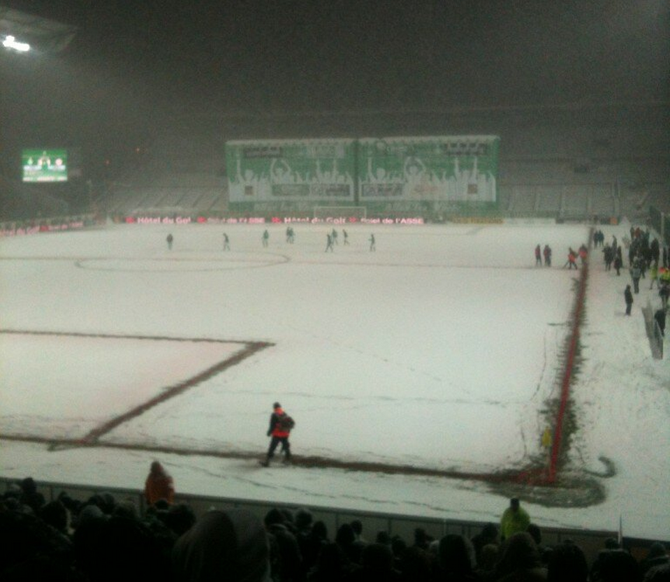 Scènes surréalistes, aujourd'hui, au stade Geoffroy Guichard, où Saint-Etienne recevait le MHSC ! En dépit de chutes de neiges abondantes et d'une interruption proche des 45 minutes au-delà desquelles la rencontre aurait dû être annulée et rejouée avec une remise à zéro du tableau d'affichage, le match est finalement arrivé à son terme, deux heures et demie après son coup d'envoi. Avec beaucoup de glissades et de faux-rebonds, neige oblige...