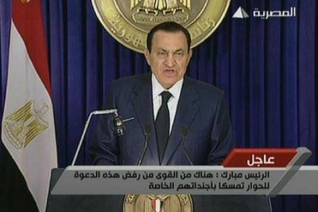 Le président Moubarak s'est exprimé jeudi soir à la télévision nationale, servant sans trop de surprise un discours démagogique taillé dans la langue de bois, avec des menaces à peine voilées, invoquant encore une fois "la main de l'étranger" et alimentant la théorie du complot, non sans tenter de jouer sur la corde sensible.