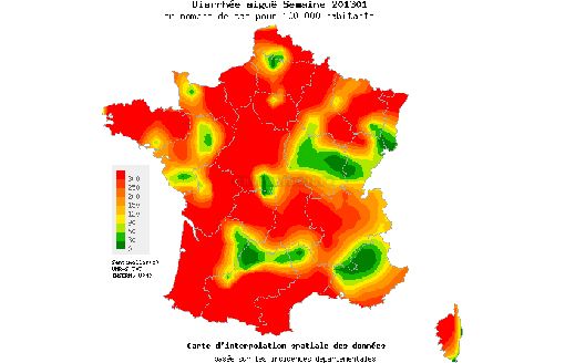 La semaine dernière, le nombre de nouveaux cas a été de 262 000. Les régions les plus touchées à cette période étaient : Midi-Pyrénées (627 cas pour 100 000 habitants), Languedoc-Roussillon (555), Limousin (514), Aquitaine (509), Centre (482), Nord-Pas-de-Calais (463), Haute-Normandie (440) et Poitou-Charentes (410).
