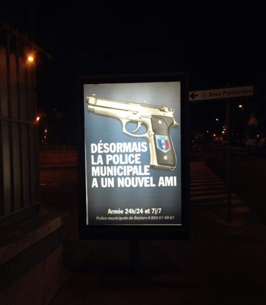Que dire face à une telle affiche qui trône dans les rues de Béziers dirigée par l’inénarrable Robert Ménard, maire de longue mèche avec le Front National qui a équipé 6 policiers municipaux de nuit de 7.65 automatique, le 1er février dernier ? On y voit un revolver au repos, en mode pose shooting, ornementé de cette phrase impactante, calligraphiée en toutes majuscules : « Désormais, la police municipale a un nouvel ami ».