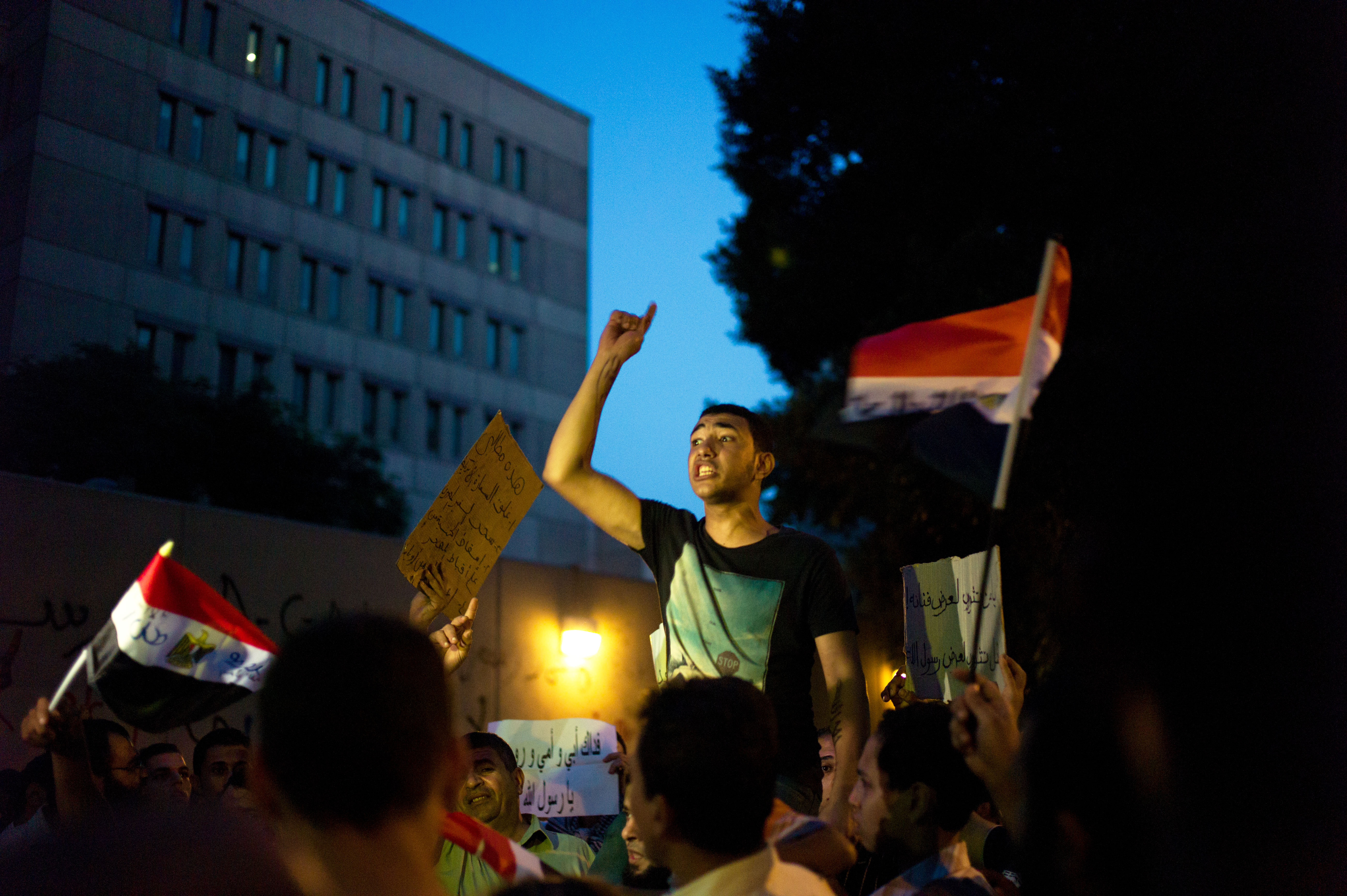 En Égypte, des milliers de manifestants, en majorité des salafistes également, ont attaqué l'ambassade américaine au Caire. Ils sont parvenus à arracher le drapeau américain, avant de le remplacer par un étendard islamique.