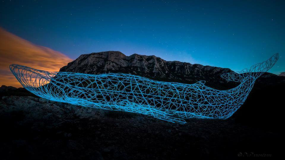 « Aurora est faite de tiges métalliques soudées gainée de tube de silicone phosphorescent. Elle parait blanche le jour et phosphorescente la nuit. Reposant au sol, la queue relevée, la bête de 15 mètres de long apparait fantomatique. Comme un symptôme, celui d’une époque charnière, où le fragile équilibre du vivant est mis à mal par nos modes de vie. Nous risquons, sous peu, de parler au passé du plus grand animal n’ayant jamais existé depuis l’apparition de la vie. Celle qui, dans son propre volume, contient la potentialité d’héberger l’ensemble des espèces animales nous est rendue par les flots, ici, comme une espèce d’Arche de Noé vide : ce mammifère qui s’échoue, exhibant la menace de son extinction, c’est un peu nous-mêmes. Apparition à la fois diurne et nocturne à la trame légère, comme une dentelle, Aurora, toutefois, lie les jours d’une lumière tamisée. Elle est comme un véhicule pour passer les nuits. Comme ce navire, l’Aurora, qui fut d’abord un baleinier, puis un bateau d’exploration scientifique de la nature et du monde vivant. Entre vie et mort. Trait d’union entre les millions d’années. Bateau fantôme. Epave magique. Tant qu’il y aura des survivants et des aubes extravagantes… »