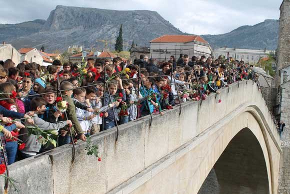 Sans le soutien des autorités, de nombreux citoyens de Mostar se sont rassemblés le week-end dernier sur le Vieux pont, érigé en 1566. Bombardé pendant trois jours par les projectiles des forces HVO (Conseil de défense croate), le monument a fini par tomber dans la rivière Neretva le 9 novembre 1993 à 10h et 16 minutes.