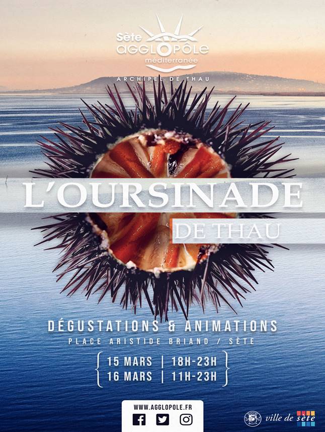 La tradition de l'oursinade made in Sète se poursuit ! Pendant deux journées (vendredi 15 mars de 18h à 23h et samedi 16 mars de 11h à 23h), des vins et des produits du terroirs (oursins, plateaux de fruits de mer, brasucades de moules, fritures de poisson à la plancha, tielles, beignets d’huîtres, …), vous seront proposés en musique !