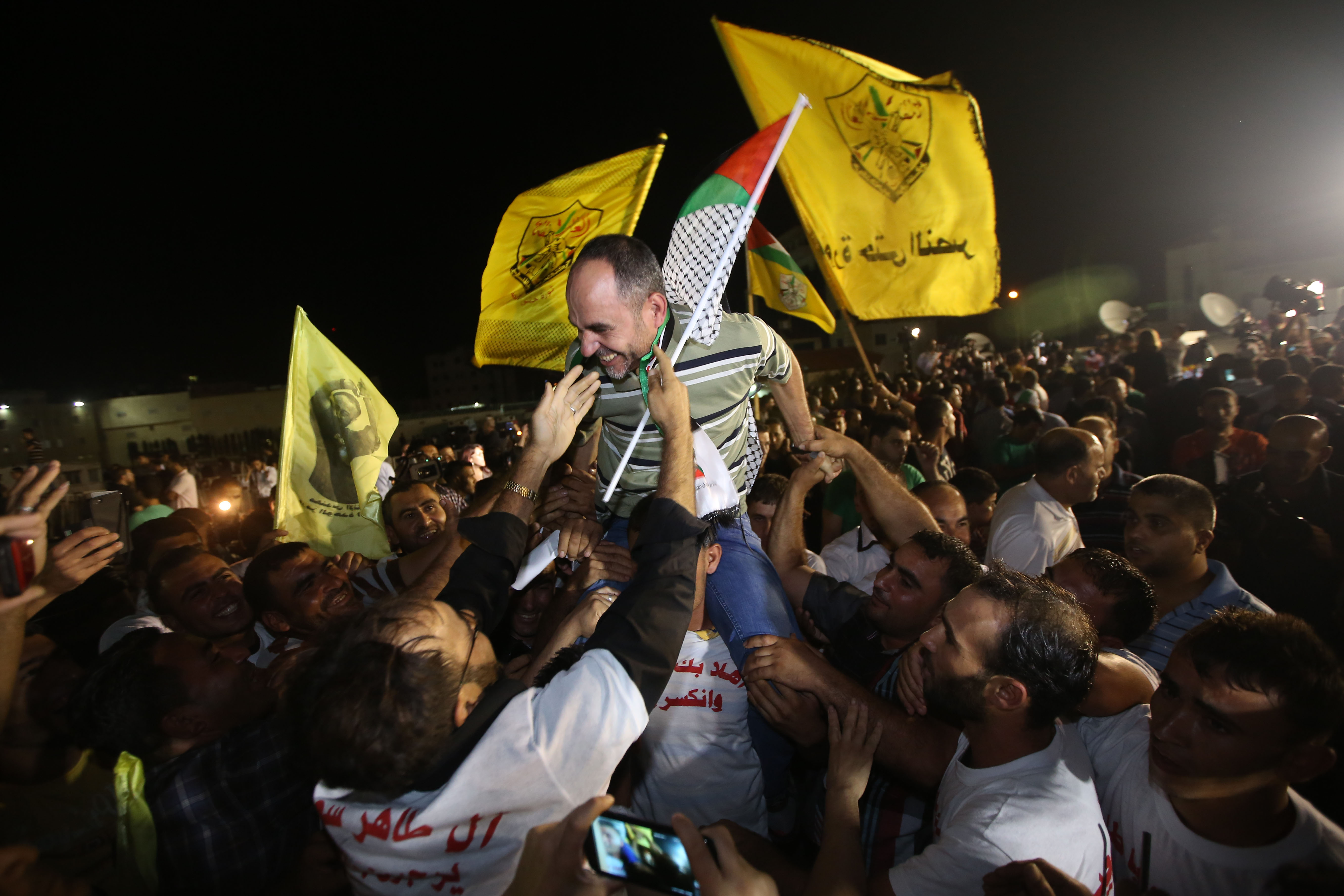 Onze des prisonniers libérés en Cisjordanie ont été transportés par autobus à un poste de contrôle de Bitunia près de Ramallah, tandis qu'un autre groupe de quinze prisonniers a été acheminé vers Erez, point de passage entre Israël et la bande de Gaza.