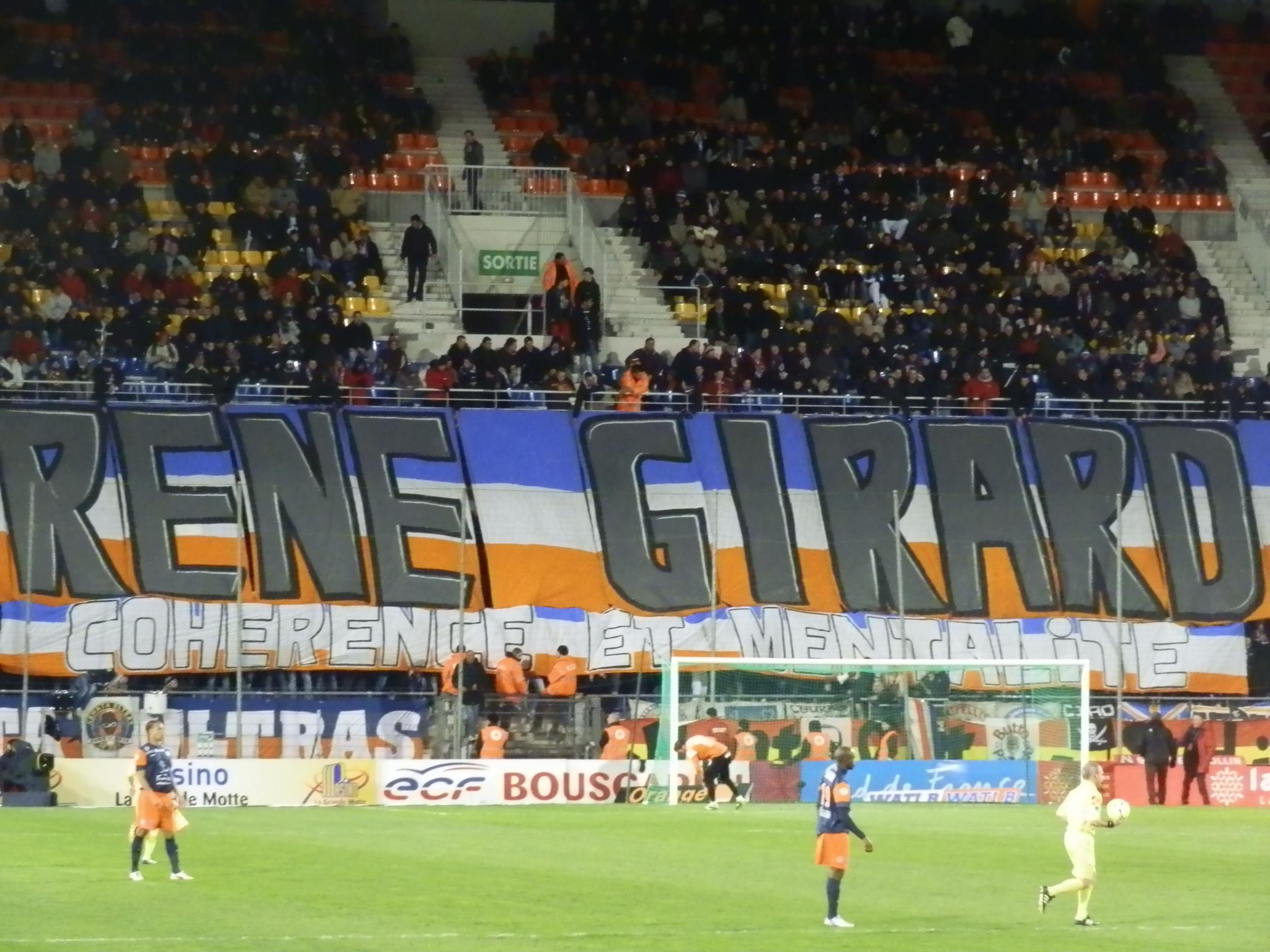 Comme annoncé le 9 mars dernier, sur Médiaterranée Languedoc-Roussillon, les supporters montpelliérains du mouvement Ultra sont en train de rendre un hommage très appuyé à René Girard, ce soir, à la Mosson. Après être allés chanter pour lui la semaine dernière à l'entraînement des joueurs de Montpellier, ce qui avait ému René Girard jusqu'aux larmes, ils ont dévoilé ce soir un tifo dans la tribune de la Butte Paillade 91, juste avant que la rencontre cruciale contre Troyes ne débute. Avec ses mots aux couleurs de la Paillade : « René Girard, cohérence et mentalité ».