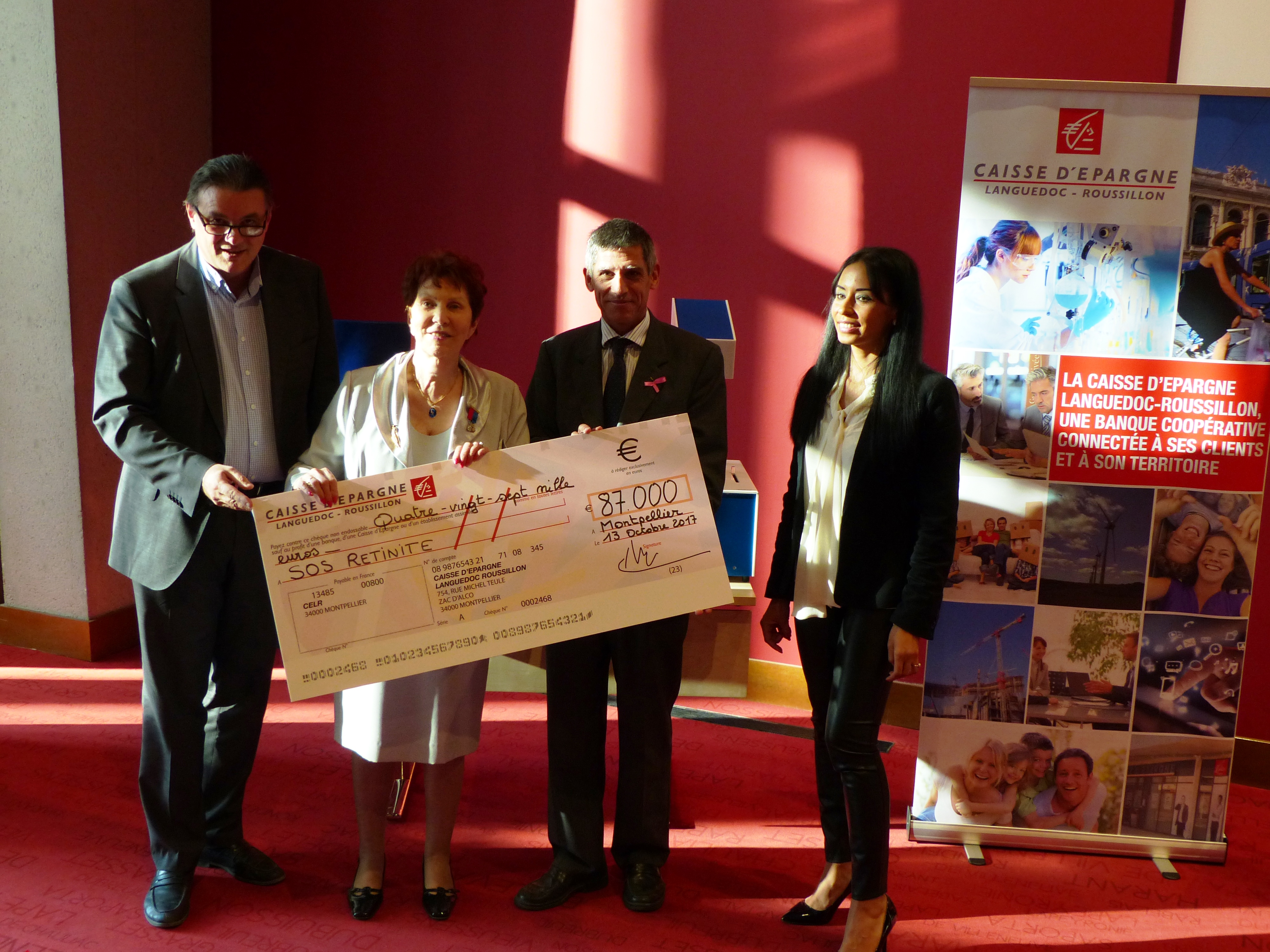 Christophe BRUNO, membre du Directoire de la Caisse d’Epargne Languedoc-Roussillon, remet une subvention de 87 000 euros à Monique ROUX, Présidente de l’association SOS Rétinite, pour permettre la mise en place d’équipements de pointe au sein de la plateforme ZebraSens.