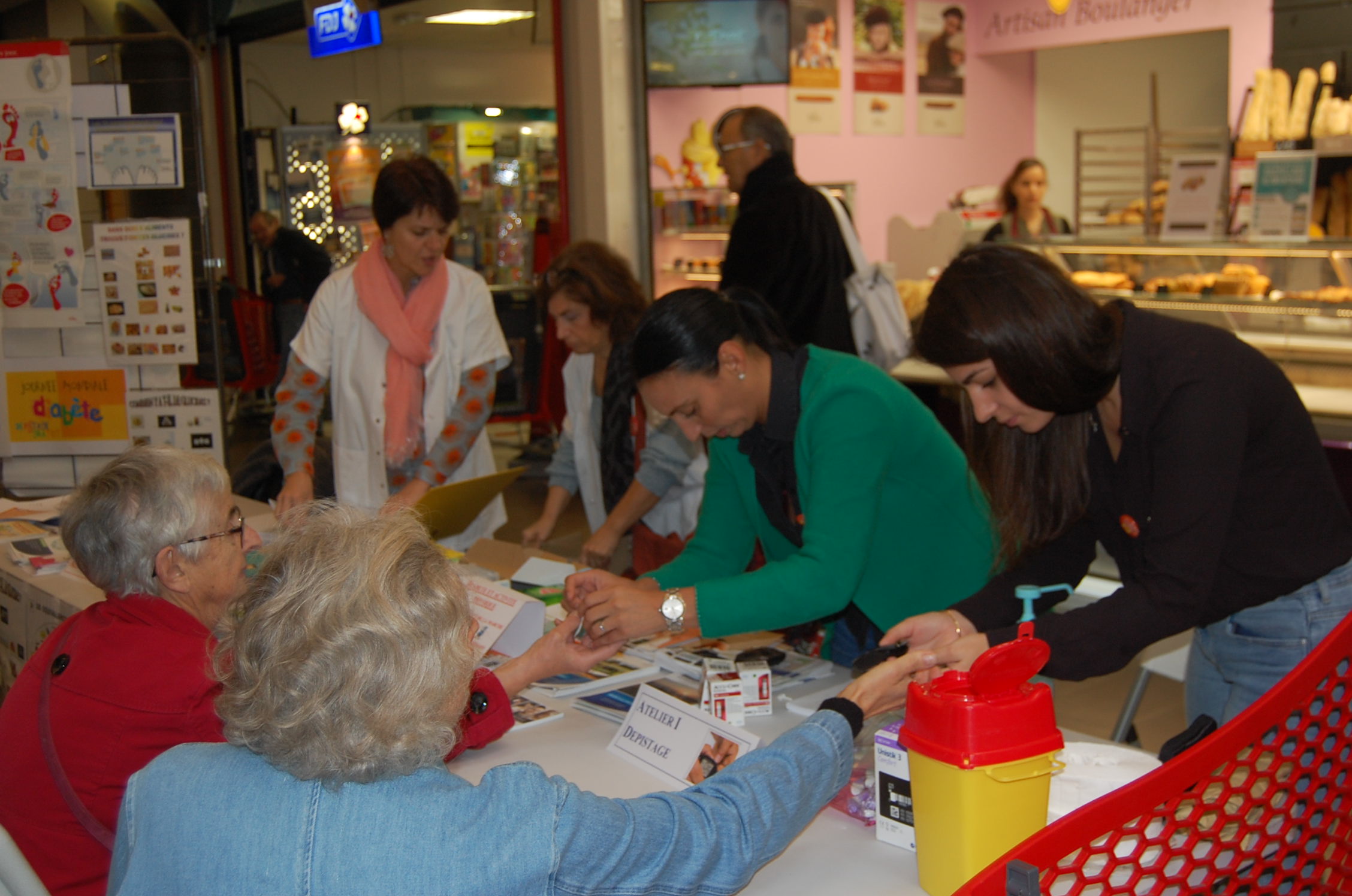 Autour de Valérie Bayard-Guisti, l’on trouvait alors en pleine action, Marie Cruz, la diététicienne attitrée, qui distribuait force fiches de bons conseils pour une alimentation saine et équilibrée, Dominique la tobaccologue, qui informait sur les méfaits du tabac sur le diabète (puisque c’était aussi le mois sans tabac), Virginie qui donnait des conseils forts pertinents sur sa spécialité, les plaies et leur cicatrisation et deux élèves-infirmières, Nassima et Amandine, qui procédaient aux « dextros », c’està-dire au contrôle de la glycémie dans le sang des personnes volontaires, au moyen d’une petite piqûre sur le doigt.