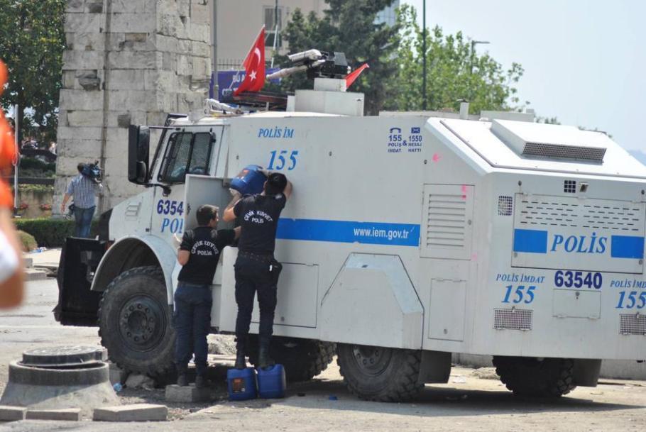 Sur ces photos, on observe un policier turc en train de déverser un produit, le Jenix, dans le réservoir d’un canon à eau. Le Jenix est un gaz poivré, fabriqué à Istanbul, dont l’utilisation est réservée à l’armée et aux autorités publiques.