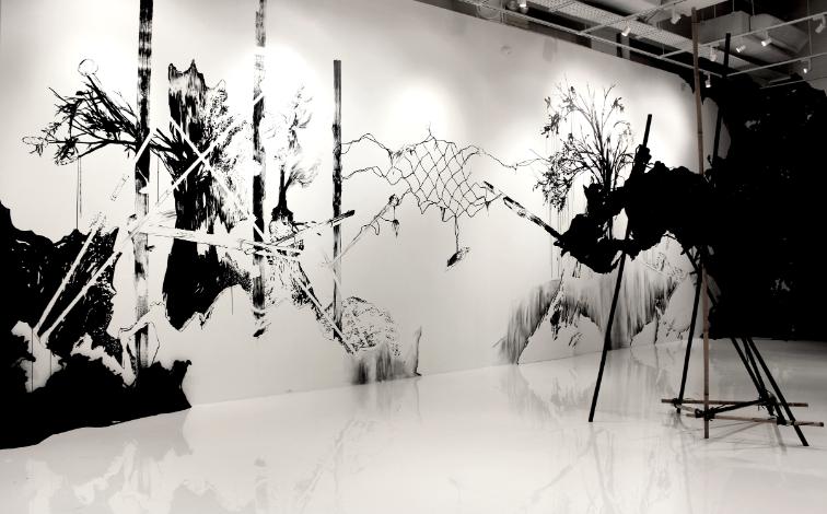 Dans son exposition « Le soleil comme une plaque d'argent mat », Abdelkader Benchamma présente une vingtaine d'œuvres au public, essentiellement des dessins en noir et blanc, de différentes tailles, du grand au petit format, composées aux feutres et à l'encre de chine, sur divers supports : papier, toile et mur.
