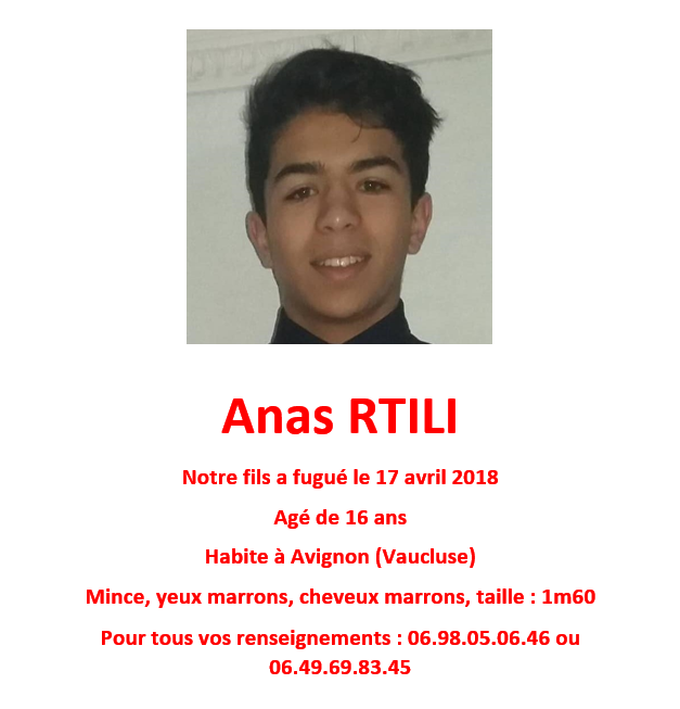Depuis mardi 17 avril 2018, Anas RTILI âgé de 16 ans a fugué de son domicile familial avignonnais et depuis n’a plus donné signe de vie.
