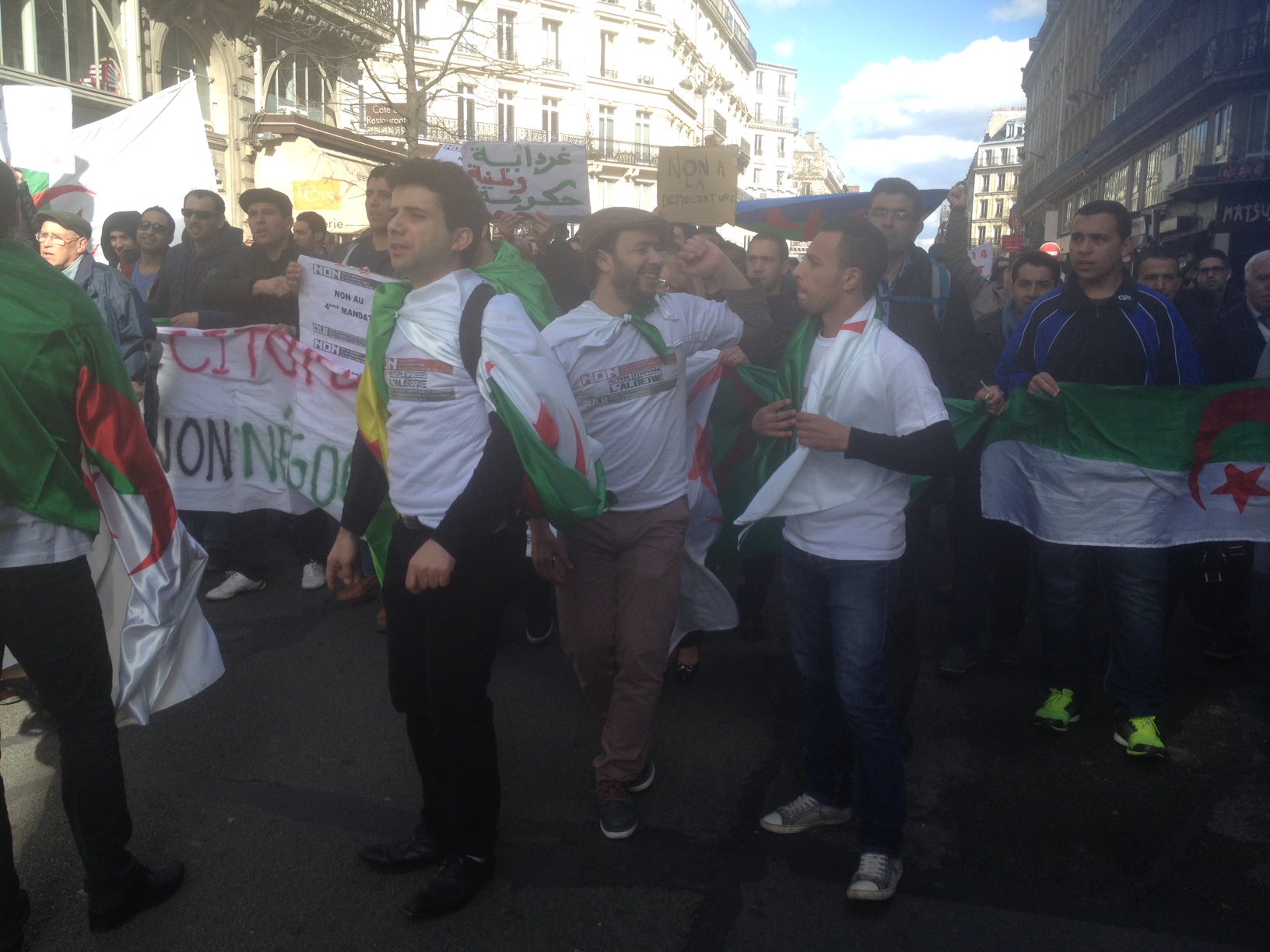Ils ont l’Algérie aux trippes et la gorge nouée de colère et d’émotion… une vingtaine de jeunes constitués en collectif «d’Action citoyenne pour l’Algérie », vêtus de tee shirt blancs frappés de l’emblème national ont rassemblé des centaines de personnes samedi 22 mars à Paris, Place de la République, avant de conduire une marche jusqu’à la Place de la Victoire en scandant des slogans anti-régime et contre le quatrième mandat de Bouteflika. « Ulach el vote Ulach ! », « Algérie libre et démocratique !», «Bouteflika, Tewfik, Said, Sellal dégage ! Jeunesse s’engage ! » et « Y’en a marre de ce pouvoir ! »