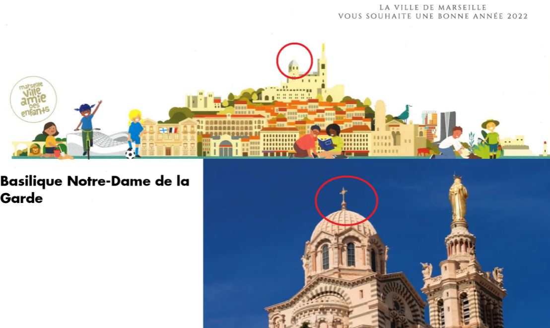 À Marseille, l’opposition de droite a fustigé les autorités locales pour avoir « omis » de dépeindre la croix sur le dôme de la basilique Notre Dame de la Garde dans la carte de vœux de la municipalité de gauche pour l’année 2022. Ainsi, la sénatrice Les Républicains (LR) des Bouches-du-Rhône, Valérie Boyer, s’est empressée de publier sur Twitter pour railler la mairie de Marseille avec une once de sarcasme :