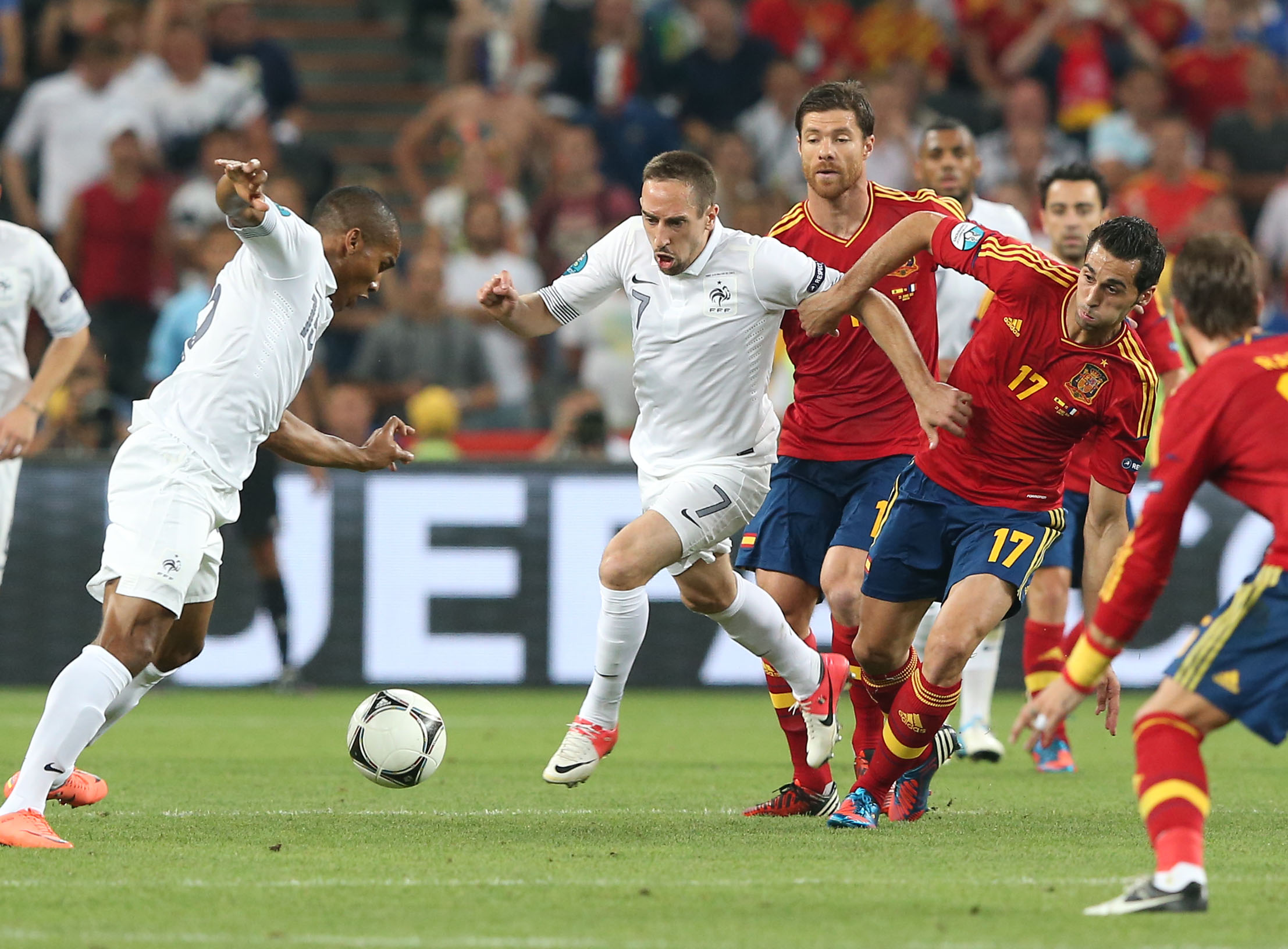 L’Espagne a dominé sans surprise dès le début de la partie. «Les hommes de Del Bosque ont concentré leurs attaques sur le flanc gauche de la défense française où le travail défensif de Ribéry laisse à désirer. Comme à leur habitude, Fabregas, Iniesta et Xavi bougent beaucoup et dézonent régulièrement » commentent Maxime Goldbaum et Erwan Le Duc, envoyés spéciaux du journal Le Monde en Ukraine.