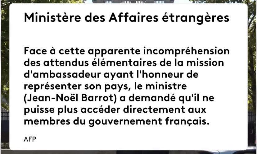 Le chef de la diplomatie française a été catégorique : « Nous n'acceptons pas que des pays étrangers, des autorités étrangères viennent s'inviter dans notre débat politique national. » Il a ajouté que la France n'avait « pas de leçon à recevoir en matière de maintien de l'ordre » ni « de l'internationale réactionnaire ». Le Quai d'Orsay a toutefois laissé la porte ouverte : si l'ambassadeur répond aux sollicitations et fournit des explications, il « retrouvera naturellement l'accès aux membres du gouvernement français ».