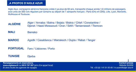 Aigle Azur déploie également une vaste campagne promotionnelle sur l’ensemble de ses escales françaises : pas moins de 5500 affiches sur Paris Ile-de-France, Lyon, Marseille, parallèlement à la diffusion d’un spot radiophonique sur Radio France Maghreb, Beur FM et Salam FM.