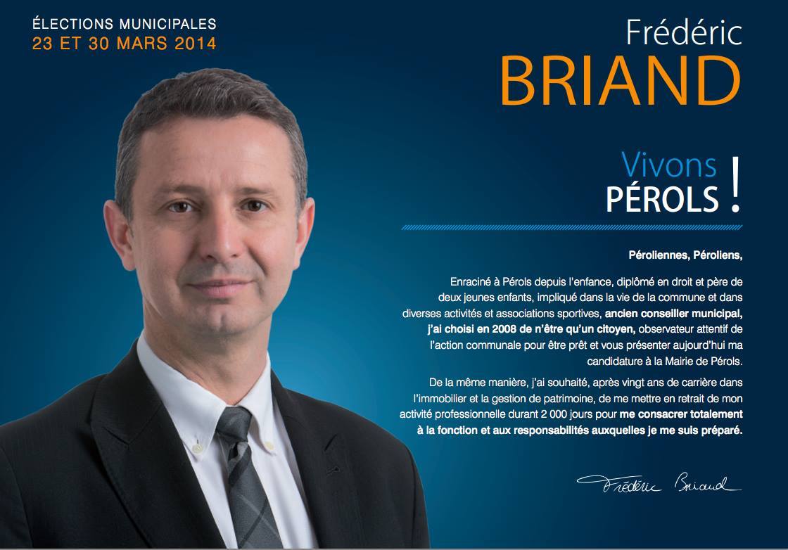 Il y a un an, Frédéric Briand était candidat DVD aux municipales de Pérols, commune proche de Montpellier et hors du canton de Frontignan. Très discret, voire invisible et muet dans cette campagne, Frédéric Briand ne le crie pas sur tous les toits, mais il est aussi passé successivement, avant son enrôlement par le FN, à l'UMP et à l'UDI où militants et élus, comme Jean-Louis Borloo, se rappellent encore de lui et de ses vives exigences d'investiture.