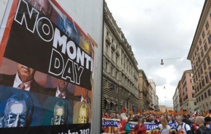 Mot d’ordre de la manifestation qui s’est déroulée dans le calme, drapeaux rouges et poings levés : «Avec l'Europe qui se rebelle, chassons le gouvernement Monti !»