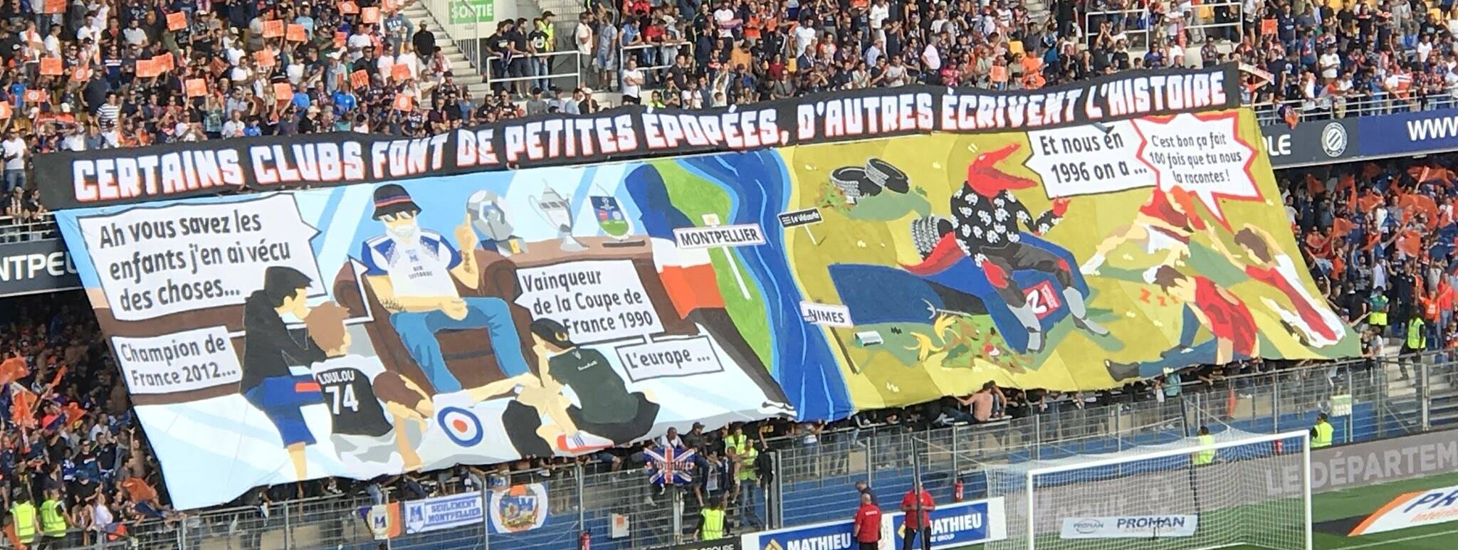 Retour en arrière ! La Mosson était chaude bouillante, ce soir. 25 000 places remplies, dont 600 Nîmois et un magnifique tifo montpelliérain présenté aux yeux de toutes et tous, là où il n’y avait plus rien depuis le début de la saison, discrétion et code ultra oblige, sauf les beaux et vigoureux chants "ici, c’est la Paillade !" On vous laisse juger par vous-même de la qualité de la banderole brandie haut les cœurs ce soir, en début de match, pour la première fois de la saison :