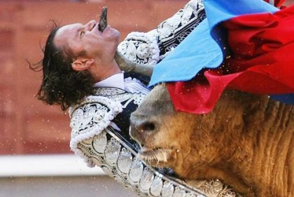 Aparicio, 41 ans, a été blessé de façon spectaculaire: la corne du taureau a transpercé le bas de sa mâchoire et le haut de son cou, et elle est ressortie par sa bouche.