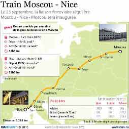 La train partira de Moscou une fois par semaine empruntant au passage un circuit des grandes capitales européennes comme Minsk (Biélorussie), Varsovie (Pologne), la République tchèque, Vienne (Autriche), le Brenner (entre l’Autriche et l’Italie), Milan, Gênes (Italie) avant d’arriver sur la Côte d’Azur.