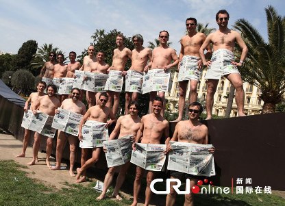 Les salariés du Nice-Matin, quotidien français, se mettent à nu pour protester contre la décision de la vente de leur siège historique de la société à Nice (Alpes-Maritimes).