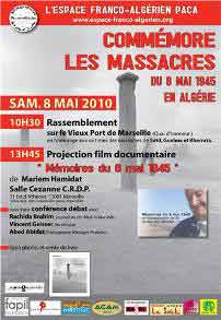 La commémoration de cet « autre 8 mai 45 » sera ainsi l’occasion de rendre hommage aux victimes autour d’un rassemblement symbolique sur le vieux Port de Marseille à 10h30. La journée se poursuivra autour de la projection du documentaire de Mariem Hamidat « Mémoires du 8 mai 1945 ». Elle se terminera sur un débat avec le sociologue Vincent Geisser et animé par Rachida Brahim, journaliste à www.med-in-marseille.info. Le photographe Abed Abidat présentera quant à lui, son ouvrage photographique aux marseillais. Un ouvrage qui sortira symboliquement ce 8 mai 2010.