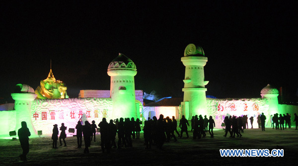 Une œuvre illuminée composée de sculptures sur neige s'expose au regard admiratif des touristes dans un parc à thème, à Mudanjiang, dans la province du Heilongjiang (nord-est de la Chine).