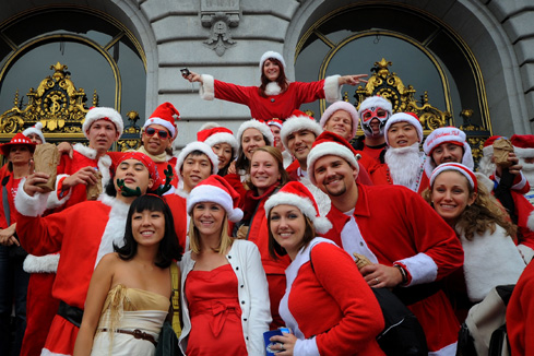 Deux filles lors d'un défilé de Pères Noël, le 4 décembre 2010 à San Francisco, aux Etats-Unis. Des centaines de résidents locaux ont participé samedi à ce défilé annuel à San Francisco.